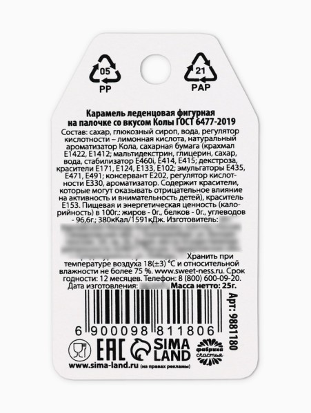 Состав: сахар, патока, вода, лимонная кислота, краситель "Уголь растительный", ароматизатор "Кола", вафельная пищевая бумага.