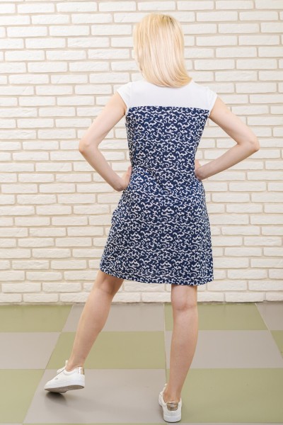 Лёгкое, красивое платье прямого силуэта с коротким втачным рукавом. Кокетка отрезная над грудью, выполнена в белом цвете и с круглым вырезом горловины. Основная часть платья с узорным рисунком в синих и белых тонах. Отличное платье для летних прогулок.