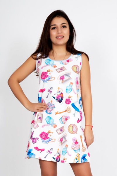 Кто из нас не мечтал оказаться на месте Алисы и попасть в сказочную страну? В очаровательном мини на широких бретелях и с тематичным принтом «Страна Чудес» сама найдет вас! Модель выполнена из качественного трикотажа, в котором будет комфортно в жаркую летнюю пору.