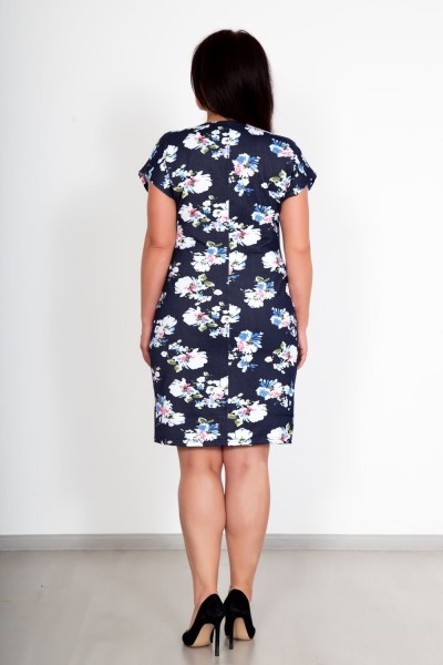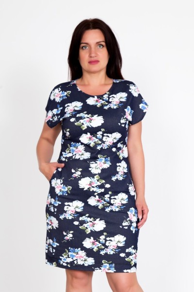 Красивое футерное платье с цветочным рисунком на тёмном фоне. Платье приталенного силуэта с цельнокроеным коротким рукавом. Вырез по горловине – круглый. Модель дополнена боковыми карманами.