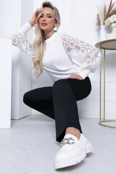 Мягкий джемпер с пышным ажурным рукавом станет фаворитом осеннего гардероба. Такая модель способна гармонично украсить любой образ. Для соблюдения баланса в силуэте к объёмному верху подбирайте ровный или зауженный низ.