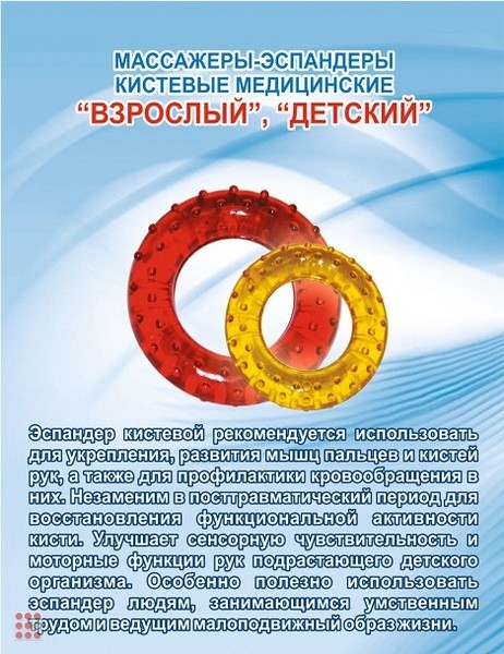 Массажер-эспандер кистевой медицинский детскийРекомендуется использовать для укрепления, развития мышц пальцев и кистей рук, а также для профилактики кровообращения в них. Массажер-эспандер кистевой медицинский детский улучшает сенсорную чувствительность и моторные функции рук подрастающего детского организма.