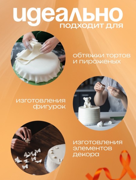 Способ применения: Перед использованием необходимое количество мастики рекомендуется размять до получения мягкой пластичной консистенции на сухой, слегка подпыленной сахарной пудрой поверхности. Данная мастика легко окрашивается всеми видами пищевых красителей на любой основе и со всеми видами паст для моделирования и обтяжки.
