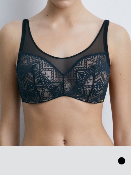 Бюстгальтер из кружева с уплотненной полупоролоновой формованной чашкой на косточках. Перед дополнен полупрозрачной эластичной сеткой, которая создает эффект вуали на обнаженной коже.
