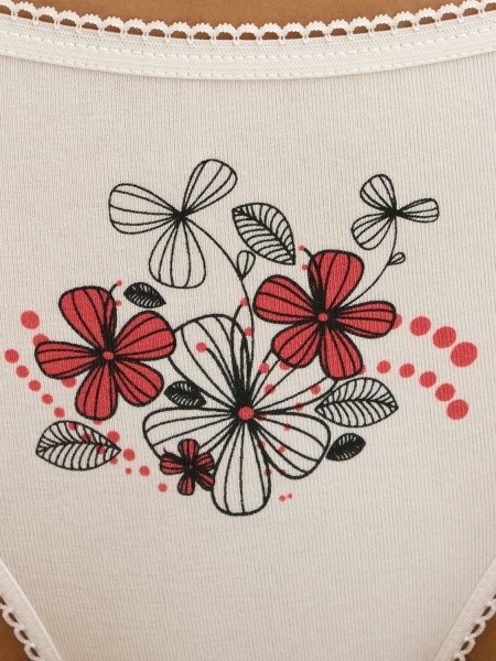 Трусы - слипы со средней линией талии и узкой боковиной. Практически полностью закрывают ягодицы. Выполнены из высокогигиеничного хлопка, который отлично пропускает воздух, впитывает влагу, не подвержен деформации и пилингу, приятно прилегает к телу и подходит даже для самой чувствительной кожи. Края обработаны мягкими эластиками с кружевными фестонами.