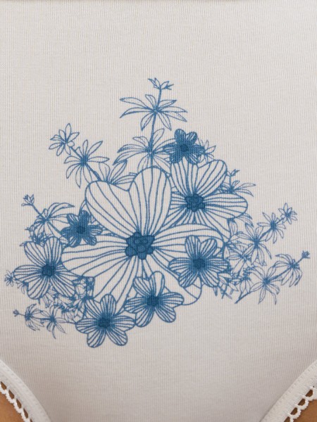 Трусы - слипы со средней линией талии с широкой боковиной. Практически полностью закрывают ягодицы. Изготовлены из высокогигиеничного хлопка, который не подвержен деформации и пилингу, отлично пропускает воздух, впитывает влагу и подходит даже для самой чувствительной кожи. Края обработаны мягкими эластиками с кружевными фестонами.