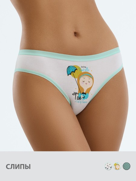 Трусы - слипы со средней линией талии и узкой боковиной. Практически полностью закрывают ягодицы. Изготовлены из высокогигиеничного хлопка, который отлично пропускает воздух, впитывает влагу, не подвержен деформации и пилингу, приятно прилегает к телу и подходит даже для самой чувствительной кожи. Края, обработанные мягкими эластиками с кружевными фестонами, создают дополнительный комфорт.