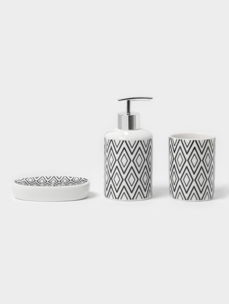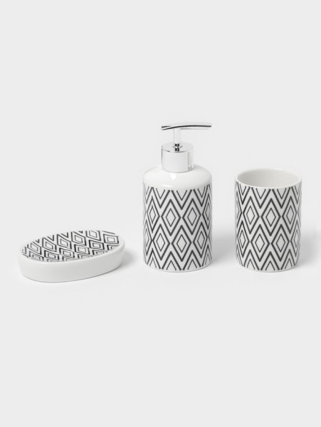 Набор аксессуаров организует пространство и станет стильным украшением Вашей ванной комнаты. За счет сдержанного дизайна данный керамический набор в ванную подойдет к любому дизайну ванной комнаты. Набор состоит из 3 предметов: дозатор, мыльница, стакан.