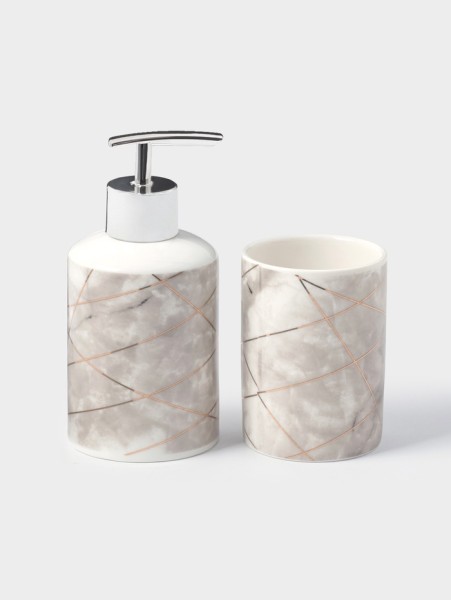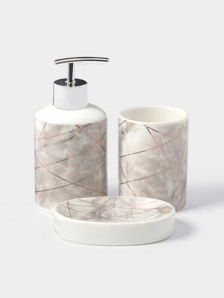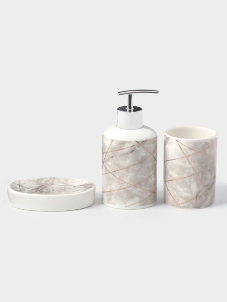 Набор аксессуаров организует пространство и станет стильным украшением Вашей ванной комнаты. За счет сдержанного дизайна данный керамический набор в ванную подойдет к любому дизайну ванной комнаты. Набор состоит из 3 предметов: дозатор, мыльница, стакан.