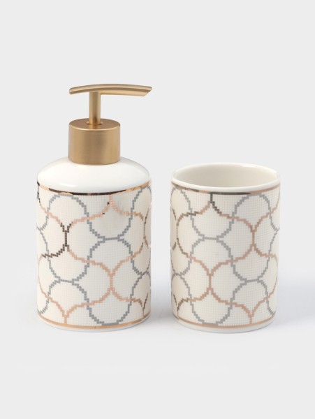 Набор аксессуаров организует пространство и станет стильным украшением Вашей ванной комнаты. За счет сдержанного дизайна данный керамический набор в ванную подойдет к любому дизайну ванной комнаты. Набор состоит из 3 предметов: дозатор, мыльница, стакан.
