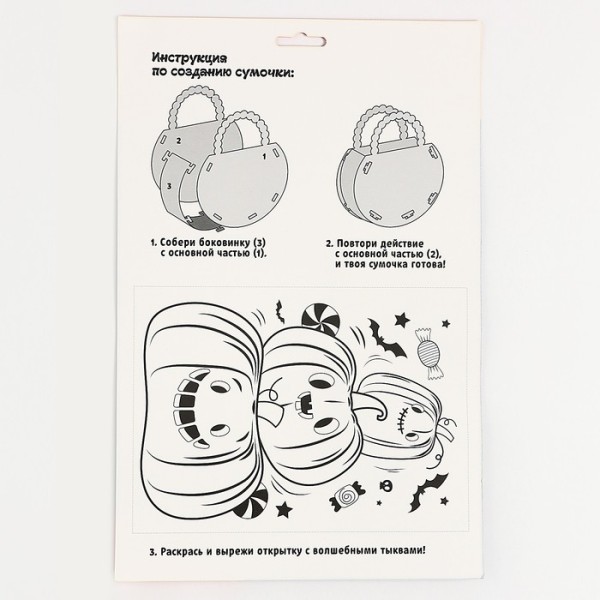 Сделайте сумочку для сбора конфет! Если вам кажется это сложным для ребенка, то спешим уверить в обратном, все просто! Ведь такой набор предусмотрен для детей от 3 лет. Достаточно просто скрепить детали из фетра в специальных местах, для этого не понадобится использование иглы. Материалы безопасны для ребенка, чтобы выполнить такую поделку, достаточно следовать инструкции на обороте.