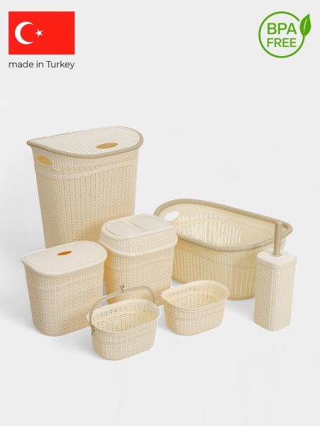 Набор для ванной комнаты 7 предметов, корзина 4 шт., корзина для белья, ведро для мусора, ёрш, бежевый