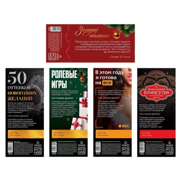 Порадуйте себя и вторую половинку оригинальным подарком с пикантным содержанием. Набор из пяти видов купонов поможет максимально интересно и возбуждающе провести Новый год и зимние каникулы!