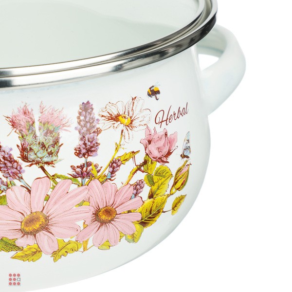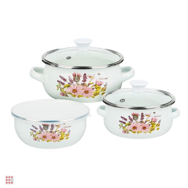 Кухонная посуда должна быть не только безопасной и крепкой, но и красивой. Набор из двух эмалированных мини-кастрюль и салатника будет ежедневно радовать глаза хозяйки и вдохновлять на приготовление новых шедевров. Эмаль — безопасный материал, который не влияет на вкус и запах пищи. Универсальный вариант для первых и вторых блюд. Идеально подходит для хранения еды в холодильнике.Преимущества:• три предмета разного объема — 0,7 и 1,1 литра,• салатник с прозрачной пластиковой крышкой,• две кастрюльки с крышками из жаропрочного стекла,• материал — высокопрочная сталь,• если не хочется мыть вручную, можно доверить это дело посудомоечной машине,• посуда украшена привлекательным цветочным принтом на белом фоне.