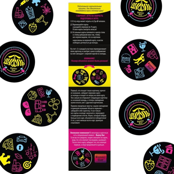 Bunny Bar – это новая игра в огромной линейке «Дуббль», созданная специально для любителей вечеринок и горячительных напитков. Внутри вас ждут 55 уникальных карт. На каждой паре карт есть одна и только одна общая картинка. Её-то вам и нужно найти!