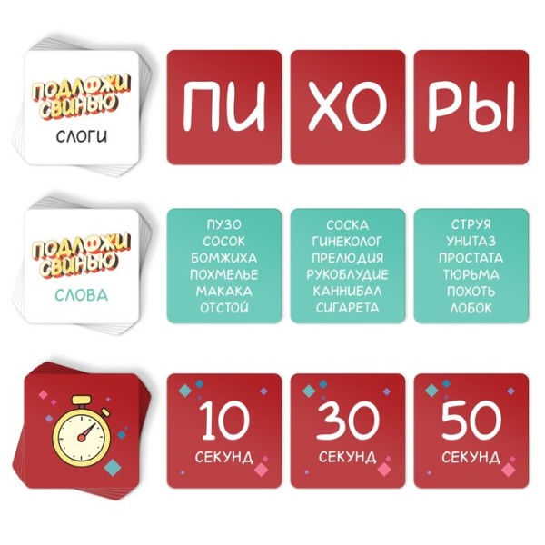 * в третьем раунде вам нужно по очереди называть слова на указанные слоги. Раунд продолжается до тех пор, пока время не истечёт. Команда, на чьей стороне оказалась фигурка свиньи на момент окончания времени, проигрывает этот раунд.