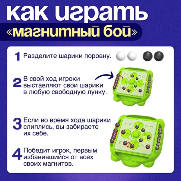 * Магнитный бой: Игроки выставляют шарики и стараются избавиться от всех своих магнитов. Если шарики соединяются, их забирает игрок, допустивший соединение.