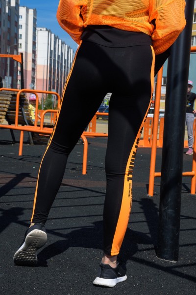 Лосины облегающие, длинные, сверху на резинке. Вдоль боковых швов расположен лампас из отделочного полотна.