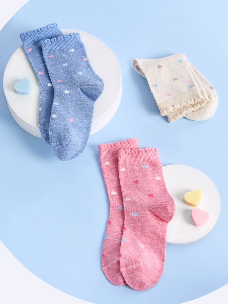 Детские носки для девочек с рисунком в виде сердечек и добавлением люрекса. Выполнены из высококачественного хлопка, который отлично пропускает воздух, приятно ощущается на теле и подходит даже для самой чувствительной и нежной детской кожи.