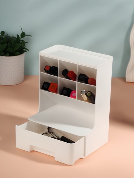 Семь секций и один ящик позволяют удобно хранить различные предметы, а три вращающиеся секции добавляют удобство использования. Прочный материал, из которого изготовлен органайзер, обеспечивает долгий срок службы и простоту ухода. Благодаря белому цвету и многоуровневой конструкции, он станет не только практичным, но и стильным элементом вашего интерьера.