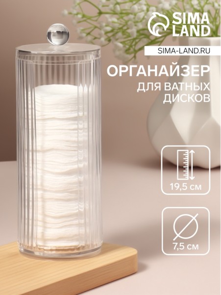 Этот органайзер помогает держать в порядке косметические средства и поддерживать гигиену. Благодаря вместительности конструкции, в него помещается стандартный запас ватных дисков. Крышка защищает содержимое от пыли и лишней влажности, а прозрачность корпуса упрощает контроль за уровнем наполнения.