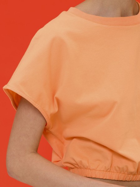 Женский кроп-топ с короткими цельнокроеными рукавами. В составе ткани преобладает хлопок — изделие приятно на ощупь и отлично подходит для жаркой погоды. Эластан помогает сохранять форму. Горловина с классическим округлым вырезом отделана рибаной, она долго не теряет форму. Низ модели собран на широкую резинку - это создаёт актуальный силуэт заправленной внутрь футболки. Такой топ благодаря лаконичному дизайну великолепно сочетается с различными шортами и брюками.