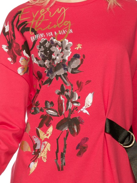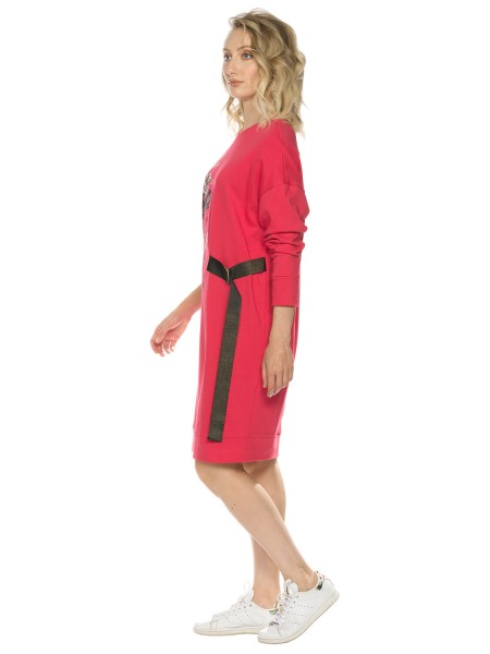Новинка! Женское платье-свитшот из пластичного футера с ассиметричной деталью - поясом из тесьмы с деликатным вкраплением люрекса. Объемный современный силуэт, спущенная линия плеча, широкие манжеты на рукавах и понизу изделия. Стойкий принт с переливами разноцветного золота. Перевод: Все происходит по какой-то причине.