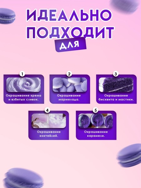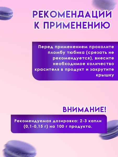 Предназначен для придания окраски бисквитам, кремам (масляный, белковый, заварной, сливочный, крем- чиз), муссам, желе, мармеладу, мороженому, взбитым сливкам, тесту, сахарной мастике, безе, макарунам, леденцам, напиткам, десертам. Подходит для окрашивания яиц. Можно использовать для творчества: мыловарение, слаймы, полимерная глина.