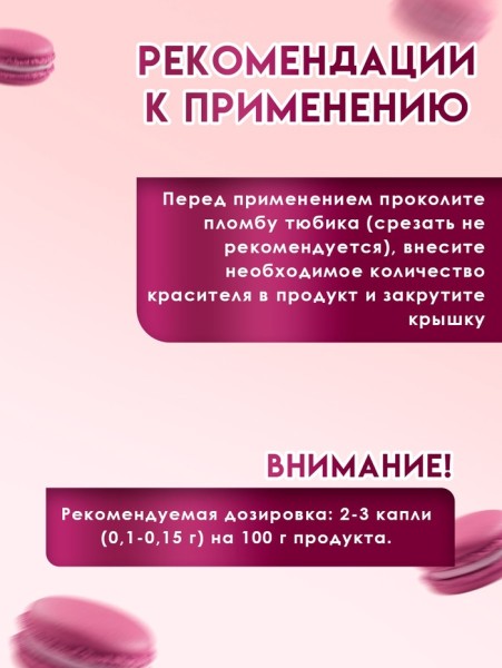 Рекомендации к применению: перед применением проколите пломбу тюбика (срезать не рекомендуется), внесите необходимое количество красителя в продукт и закрутите крышку.
