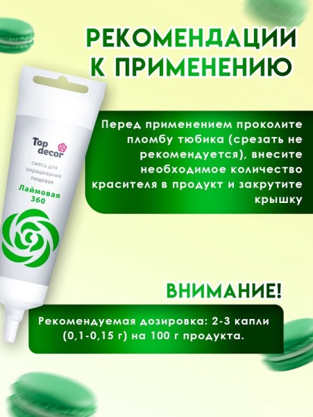 Рекомендации к применению: Перед применением проколите пломбу тюбика (срезать не рекомендуется), внесите необходимое количество красителя в продукт и закрутите крышку. Рекомендуемая дозировка 2-3 капли (1-1,5 грамма) на 100 грамм продукта.