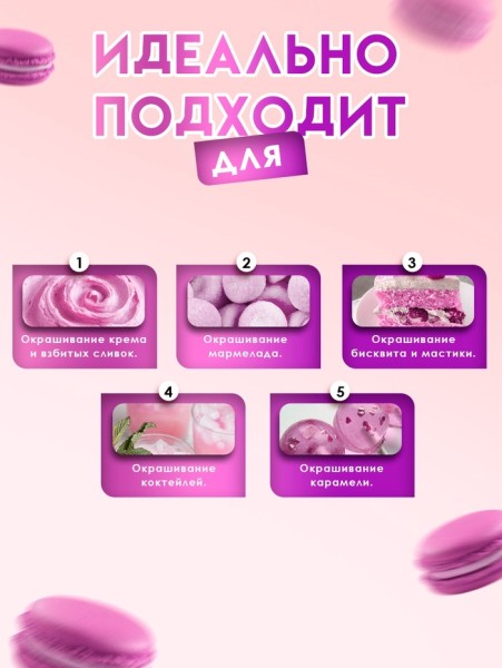 Полностью готовый к употреблению концентрированный пищевой краситель предназначен для придания окраски различным жидкостям, кремам (масляному, белковому, заварному), муссам, желе, мармеладам, джемам, мороженому, взбитым сливкам, тестам, сахарной мастике и т.д.
