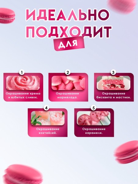 Предназначен для придания окраски бисквитам, кремам (масляный, белковый, заварной, сливочный, крем- чиз), муссам, желе, мармеладу, мороженому, взбитым сливкам, тесту, сахарной мастике, безе, макарунам, леденцам, напиткам, десертам. Подходит для окрашивания яиц. Можно использовать для творчества: мыловарение, слаймы, полимерная глина.