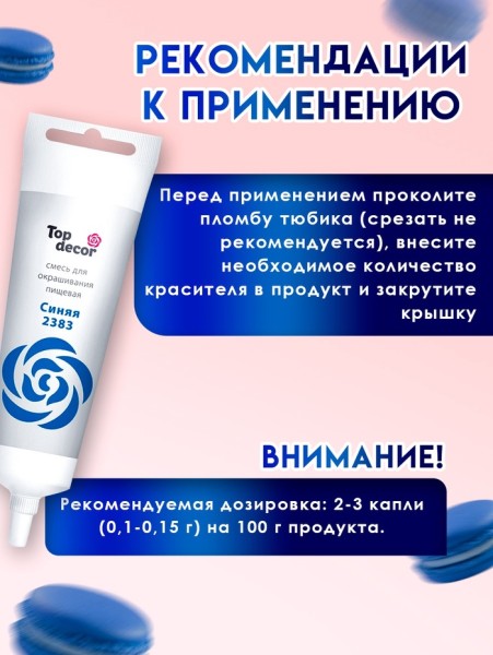 Рекомендации к применению: перед применением проколите пломбу тюбика (срезать не рекомендуется), внесите необходимое количество красителя в продукт и закрутите крышку. Рекомендуемая дозировка 2-3 капли (1-1,5 грамма) на 100 грамм продукта.