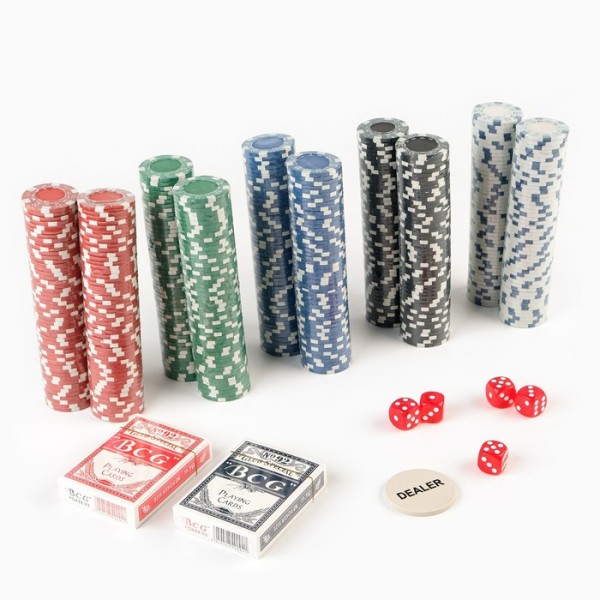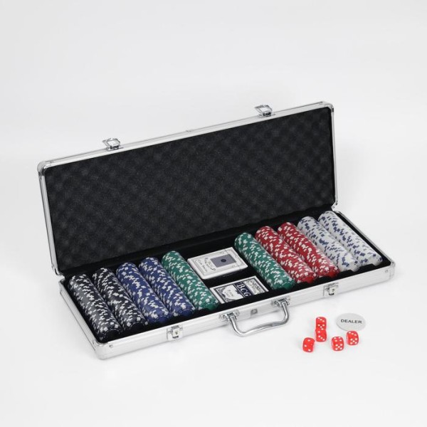 Покер в металлическом кейсе (2 колоды, фишки 500 шт. б/номинала, 5 кубиков), 20.5×56 см