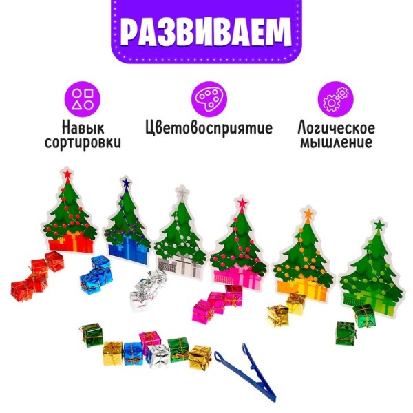 Развивающий сортер «Яркие подарки», 24 подарка, пинцет, 6 карточек, 3+