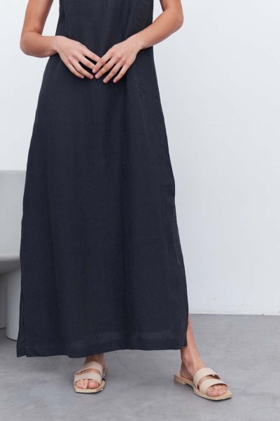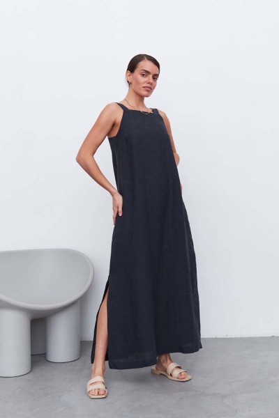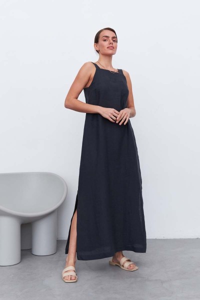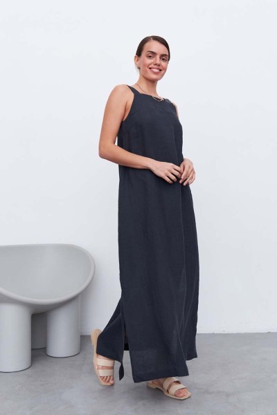 Длинный льняной сарафан на широких бретелях темно-серого цвета. Платье А-образного силуэта, c разрезами по бокам модель выполнена из 100% льна высокого качества. Сделано в России на собственном производстве.