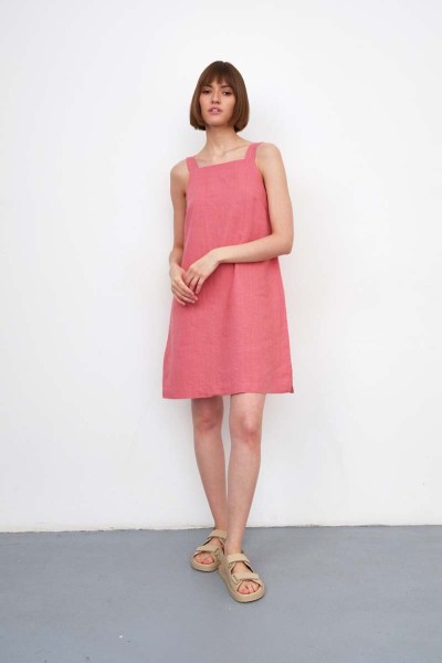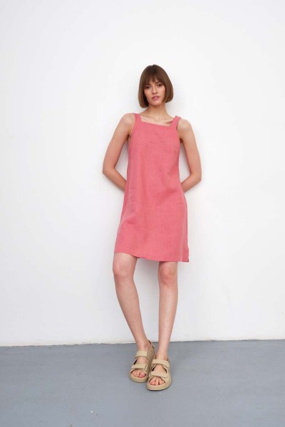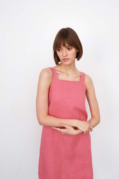 Короткий льняной сарафан на широких бретелях брусничного цвета. Платье А-образного силуэта, c маленькими разрезами по бокам. Модель выполнена из 100% льна высокого качества. Сделано в России на собственном производстве.