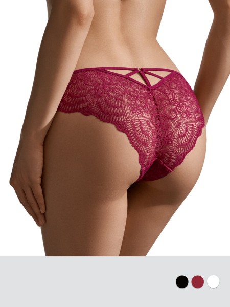 Трусы «слипы» из мягкого ажурного кружева со средней линией талии и соблазнительным V – образным вырезом сзади на эластичных лентах с декоративным металлическим кольцом. Соблазнительно подчеркивают бедра, практически полностью закрывают ягодицы. Мягкая резинка и деликатная обработка края обеспечивают почти незаметное прилегание. Гигиеничная ластовица из хлопка обеспечивает дополнительный комфорт.