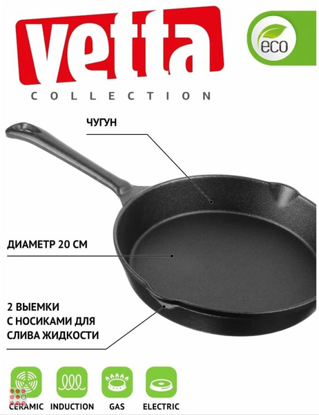 Материал чугунРазмер/Диаметр d20 смТип ручки ЦельнометаллическаяТип дна для все типов плит, включая индукциюОсобенности 2 слива