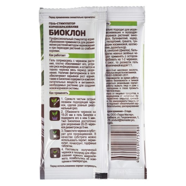 Профессиональный стимулятор корнеобразования применяется для размножения растений методом черенкования и при пересадке растений со слабыми корнями. Гель соприкасаясь с черенком растения, плотно его обволакивает, устраняя риск инфицирования, и остается на тканях черенка весь период укоренения. Наличие фитогормонов в геле обеспечивает мощный рост корней, также в Биоклоне содержится комплекс питательных веществ и витаминов, необходимых растению для создания новой корневой системы.