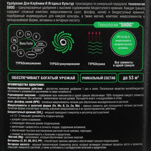 Обогащено биодоступным КРЕМНИЕМ: N:P:K + Si + Mg + Са + TE + V+SA (азот, фосфор, калий+ биодоступный кремний + магний, + кальций + микроэлементы + витамины+янтарная кислота).