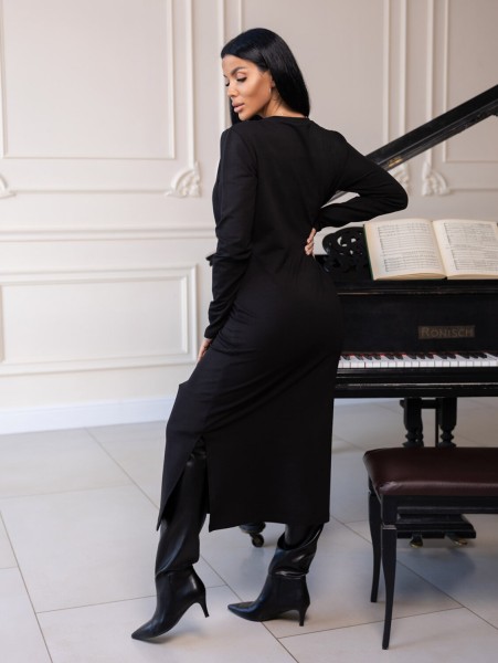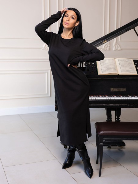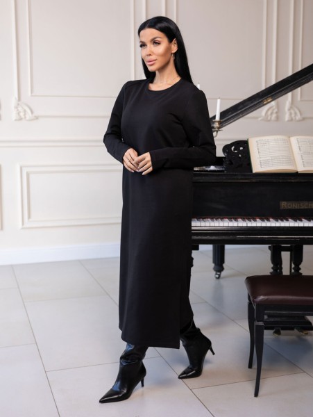Платье женское трикотажное, свободного силуэта, с боковым вырезом в нижней части. Рукав - втачной, удлиненный. Классический округлый вырез. Базовая модель, на каждый день. Отлично сидит на любом типе фигуры. Подчеркнет достоинства и скроет недостатки.