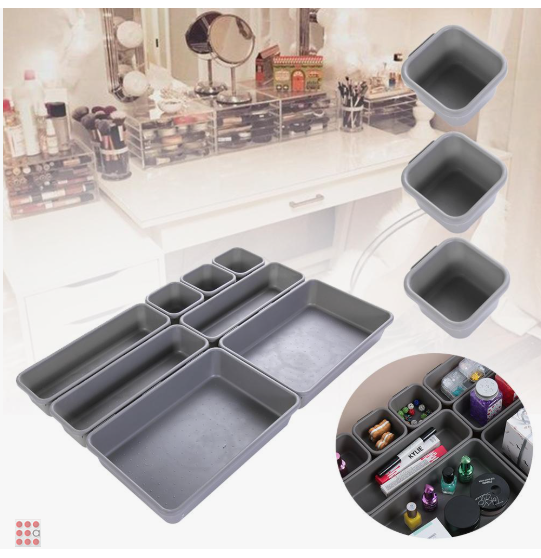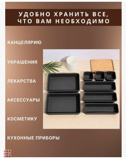 Комплект пластиковых органайзеров из 8-ми лотков разных размеров. Контейнеры предназначены для организации пространства и хранения внутри мебельных ящиков, на полках, на кухне, в ванной, в детской, в спальне, в гардеробной, в комоде, в шкафах и тд. Они обеспечивают простоту хранения вещей, игрушек, кухонных принадлежностей, посуды, помогают создать идеальный порядок и удобный доступ к содержимому, а также являются прекрасным дополнением к интерьеру.Каждый органайзер можно использовать, как по отдельности, так и вместе с остальными. Все лотки имеют крепеж, с помощью которого их можно фиксировать между собой, создавая нужную по размеру конструкцию. Органайзеры изготовлены из высококачественных полимерных материалов, что обеспечивает их прочность и длительное использование, их можно мочить, а также они легко моются. Набор органайзеров для хранения станет прекрасным подарком в любой дом и на любой праздник!