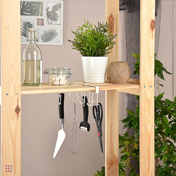 Вешалка может быть размещена на открытых полках, столешницах и использоваться для полотенец, хранения чашек и других кухонных или домашних принадлежностей.