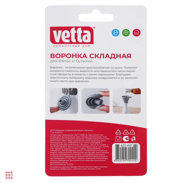 Воронка складная VETTA 7 см предназначена для переливания жидкостей, пересыпания соли и сахара. Подходит для ёмкостей с разным диаметром горлышка. Не впитывает запахи. Можно мыть в посудомоечной машине. Благодаря складной конструкции не занимает много места при хранении.