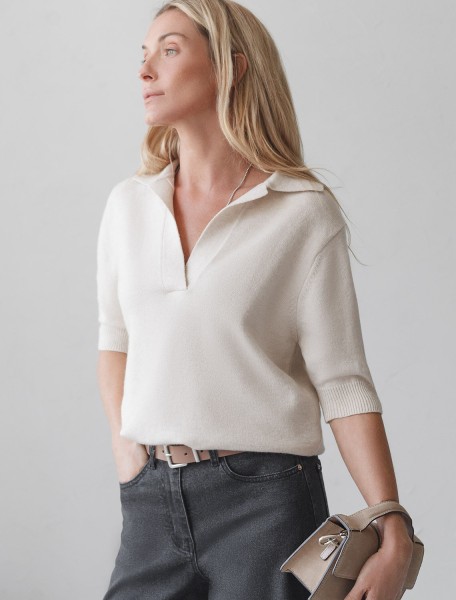 Джемпер с воротом планкой как у поло выполнен из мягкой пряжи с кашемиром. Модель с коротким рукавом свободного силуэта. Благодаря своей универсальности подойдет для любого гардероба и в офисный дресс-код. Мягкая пряжа очень приятная к телу, поддержит комфорт на протяжении всего дня, при этом не перегревая. Сочетается в костюме с брюками D38.013, D38.012 и юбкой D36.016