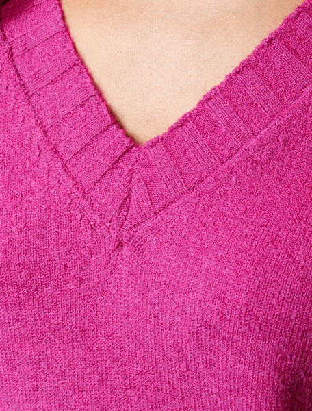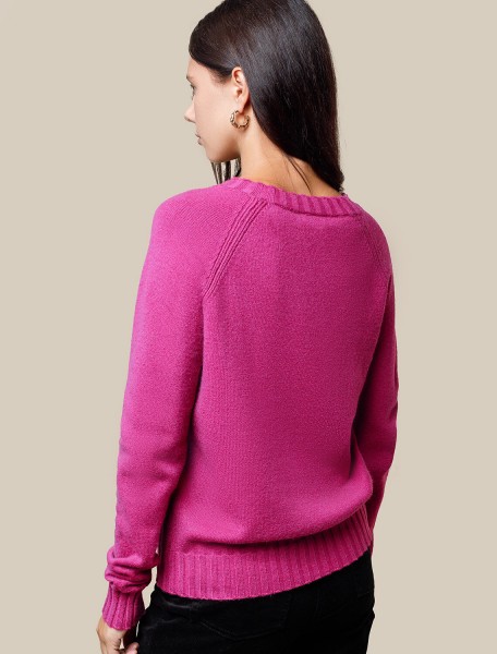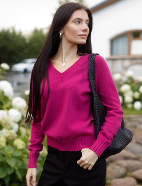 Невероятно женственный джемпер цвета фуксия с V вырезом связан из высококачественной пряжи с кашемиром — идеальное сочетание мягкости и практичности. Пряжа с кашемиром придаёт ему бархатистую нежность и тонкую структуру, каждое прикосновение с которой, напоминает о тепле и уюте в прохладные дни. Благодаря нежной текстуре материала этот вариант отлично подходит даже для чувствительной кожи, не вызывая раздражения и дискомфорта в течение дня. Сдержанный, элегантный силуэт джемпера подчёркивает вкуc обладательницы, а филигранная отделка ворота — внимание к деталям. Яркий оттенок и изящная мягкость делают его идеальным выбором в любой ситуации. Широкие манжеты и нижний край добавляют аккуратности, а продуманная посадка делает повседневный джемпер удобным для многослойных образов — от офисного комплекта, например, в сочетании с блузкой, до расслабленного уикенда. Свободный крой джемпера идеально подходит для женщин, которые ценят удобство и стиль одновременно, а так же идеально подходит на большие размеры. Благод