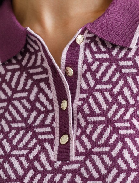 Джемпер жаккардовой вязки выполнено из нежной пряжи на основе вискозы с добавлением кашемира. Модель прямого силуэта с застежкой планкой как у поло. Фигурные золотистые пуговицы вносят изысканности и роскоши. Изделие приятно ощущается на теле и поддерживает комфортный микроклимат. Сочетается в комплекте total-look с жакетом D31.150