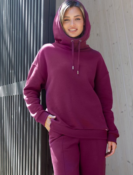 Уютное худи пурпурного цвета с цельнокроенным капюшоном и спущенной линией плеча создано для комфорта в холодную погоду. Модель выполнена из премиального футера трехнитки с мягким начесом, что обеспечивает дополнительное тепло и приятные ощущения при носке. Глубокий капюшон дополнен шнуром для регулировки объема, что обеспечивает отличную защиту от ветра и холода, а серебристая фурнитура добавляет стильный акцент к современному худи. Эластичные манжеты на рукавах и по низу обеспечивают дополнительную защиту от продувания, способствуя сохранению тепла внутри. Натуральный хлопок гарантирует дышащий эффект, позволяя сохранять оптимальный микроклимат тела даже при длительном ношении. Благодаря эластану в составе повседневное худи подходит для активного отдыха, вы будете чувствовать себя свободно в любой ситуации.