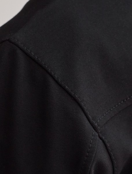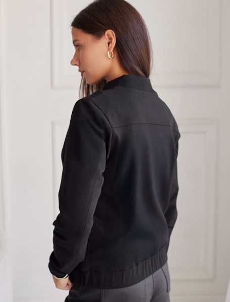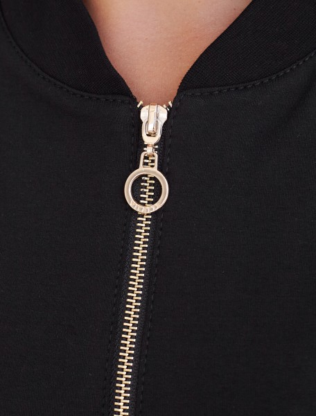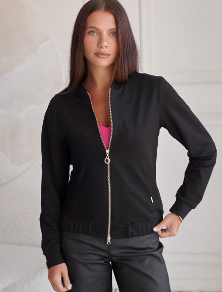 Стильный бомбер черного цвета на молнии среднего объема выполнен из премиального футера двухнитки без начеса, обеспечивает мягкость и комфорт при носке. Эластичный материал отличается дышащими свойствами, позволяя коже свободно дышать в течение дня. Качественная фурнитура гарантирует долговечность и удобство использования. Повседневный бомбер имеет аккуратный ворот и широкую резинку по низу, а также манжеты на рукавах, которые надежно фиксируют изделие и сохраняют тепло.. По бокам расположены прорезные карманы удобные для хранения необходимых мелочей или рук в прохладную погоду. Бомбер дополнен металлическим логотипом бренда. Полуприлегающий крой создает уютный образ и подходит для любого роста и размеров.